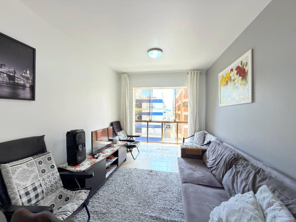 APARTAMENTO À VENDA COM VISTA PARA O MAR NO CENTRO DA CIDADE. 02 dormitórios(01 suíte) + Dependência de empregada Sacada de frente Banho social Mobiliado Vista mar Churrasqueira Orientação solar leste Área de serviço separada Living integrado 91 área total 01 Box